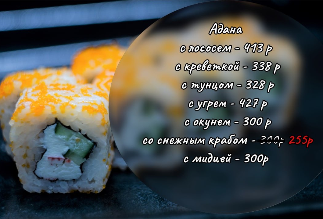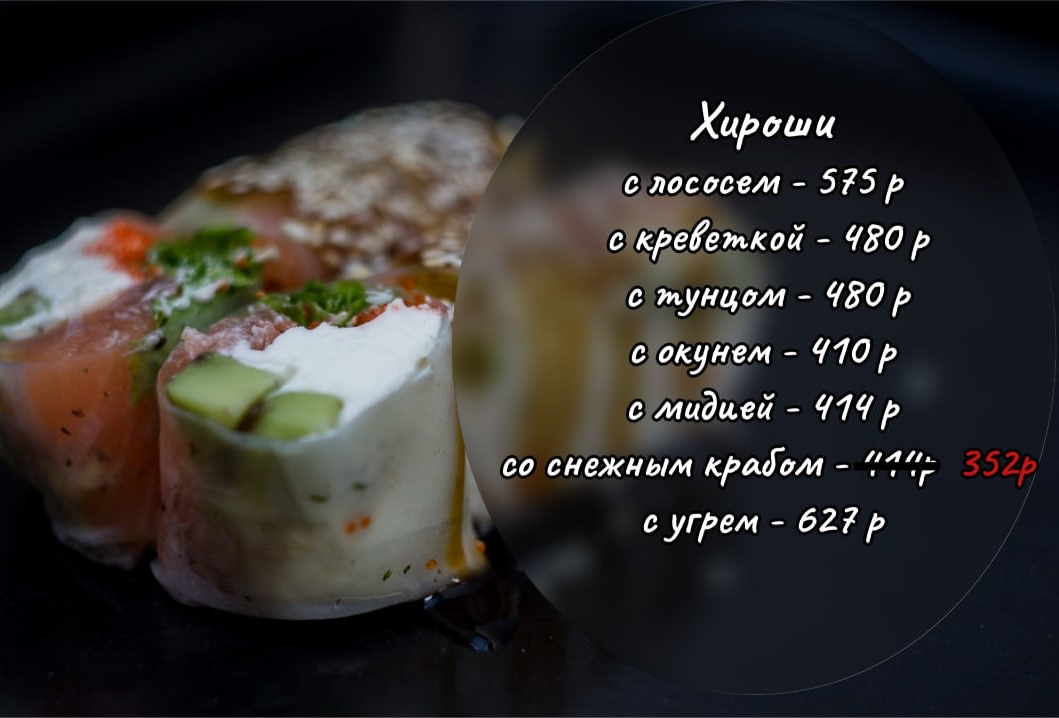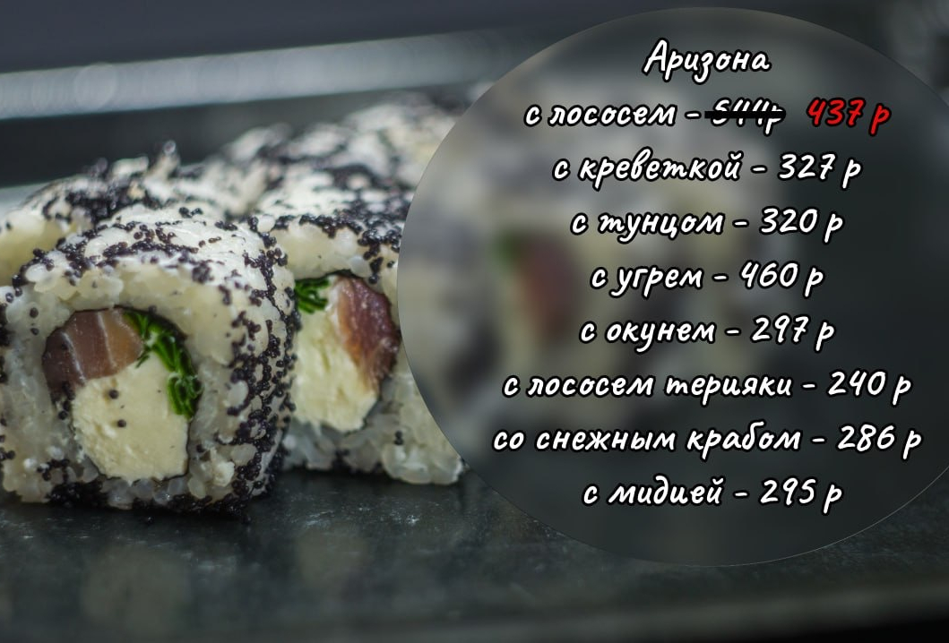 В состав ролла входит сыр фета, карамелизованный гриб шиитаке, нежный авокадо, продукт, который идет сверху - можно выбрать.