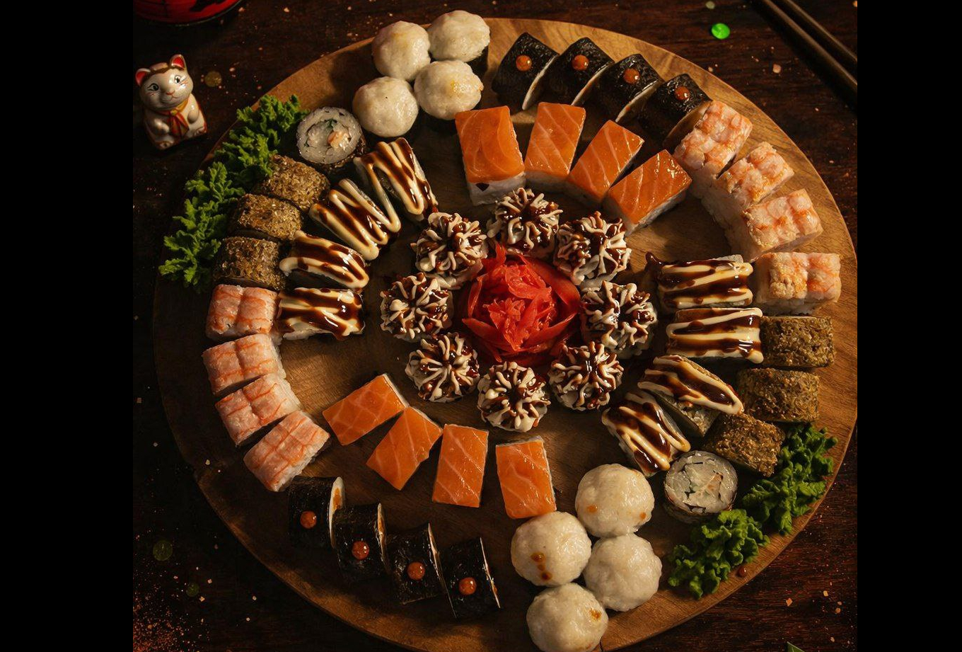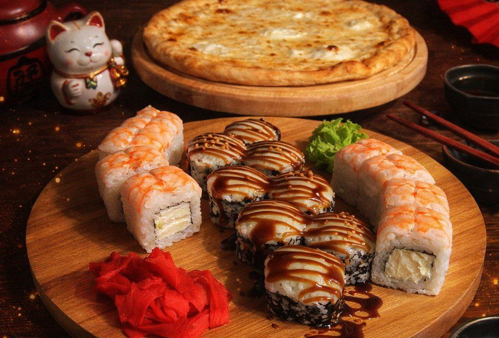 В наборе 2 порции роллов - запечённый с лососем, Эбби Дракон и пицца 4 сыра 25см