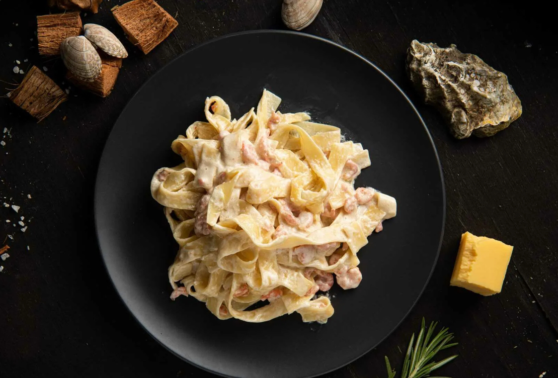Состав: паста Тальятелле, сливочное масло, бекон, сливки, лук, грибы, сыр пармезан, желток.